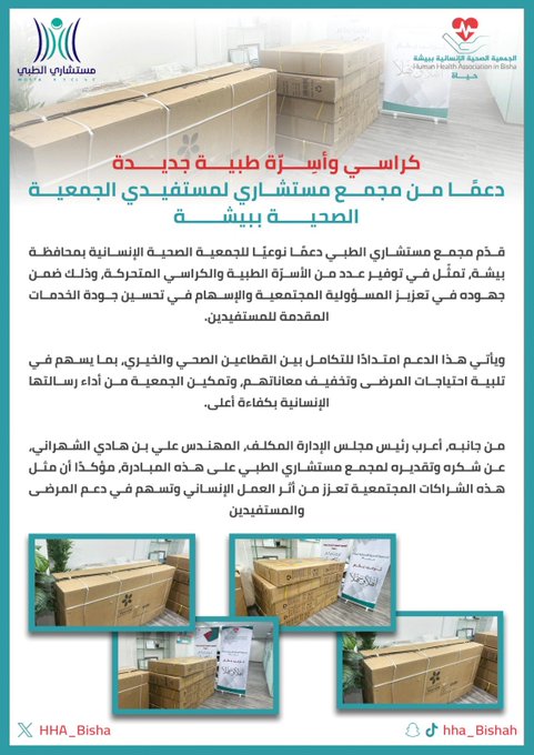 كراسي وأسِرّة طبية جديدة دعمًا من مجمع مستشاري لمستفيدي الجمعية الصحية ببيشة